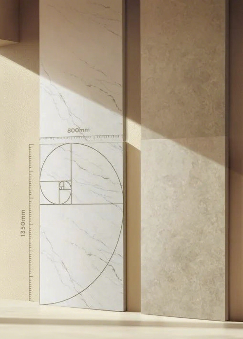 800×1350mm恰好满足现代住宅空间模数需求,上墙两片刚好到顶,铺贴更省料、接缝更少,适配厨房、客厅、卧室等多元场景,实现墙地一体搭配。