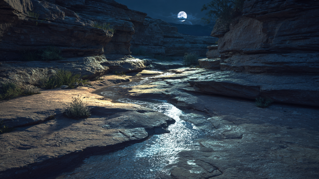 月色下泉水在砂岩上忽明忽暗,