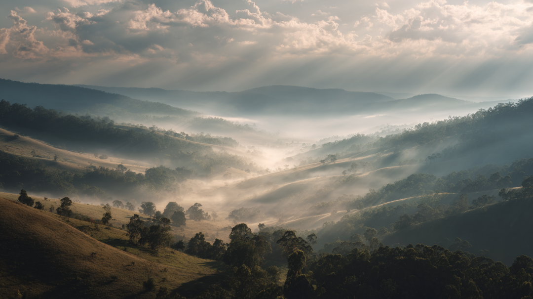 仿若晨曦初照,白雾轻覆山野。